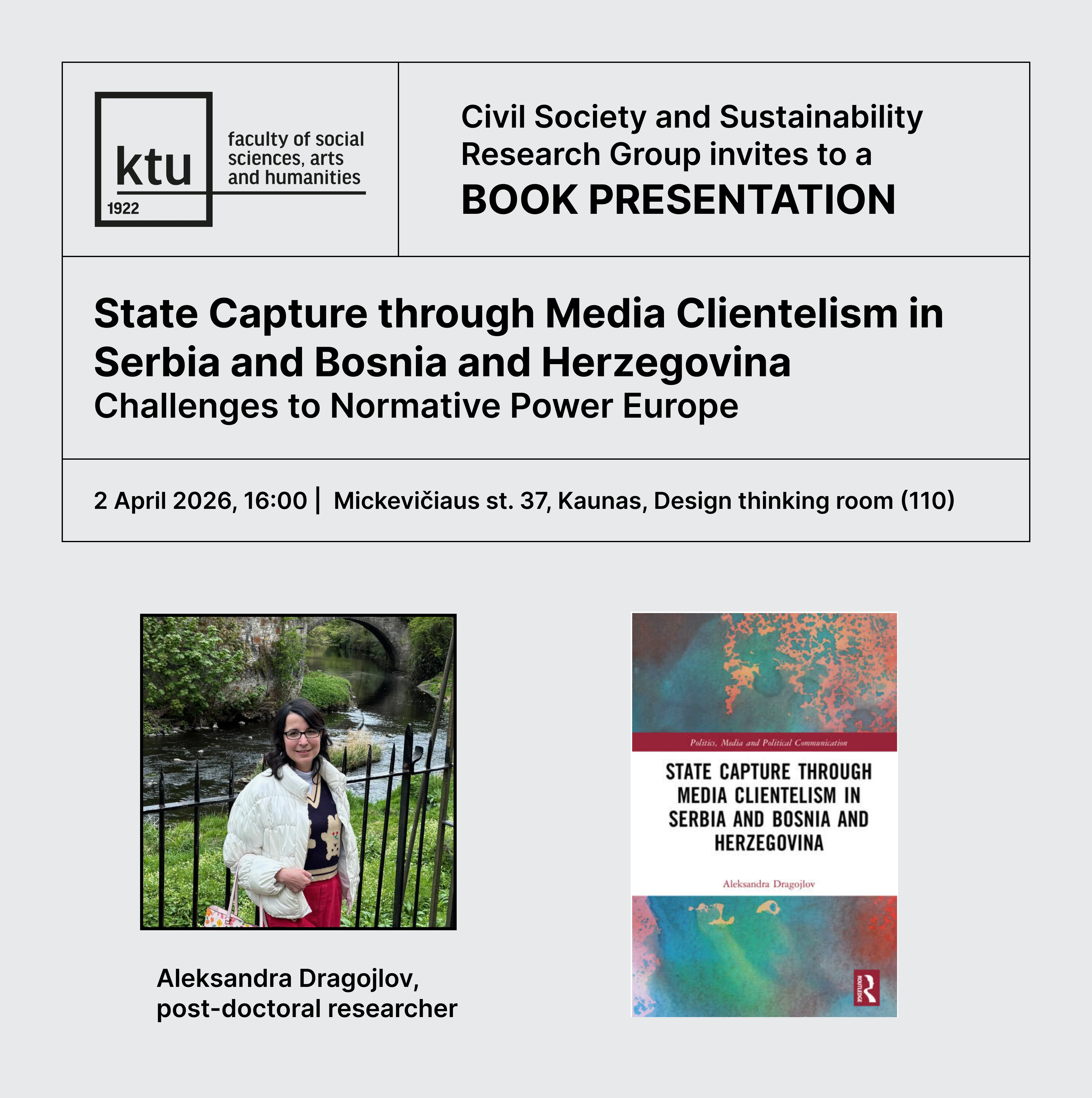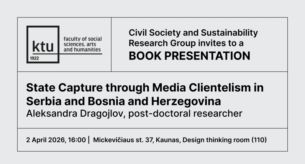 The Faculty of Social Sciences, Arts and Humanities of Kaunas University of Technology invites all faculty members, students, and guests to a book presentation “State Capture through Media Clientelism in Serbia and Bosnia and Herzegovina”.