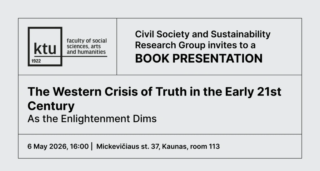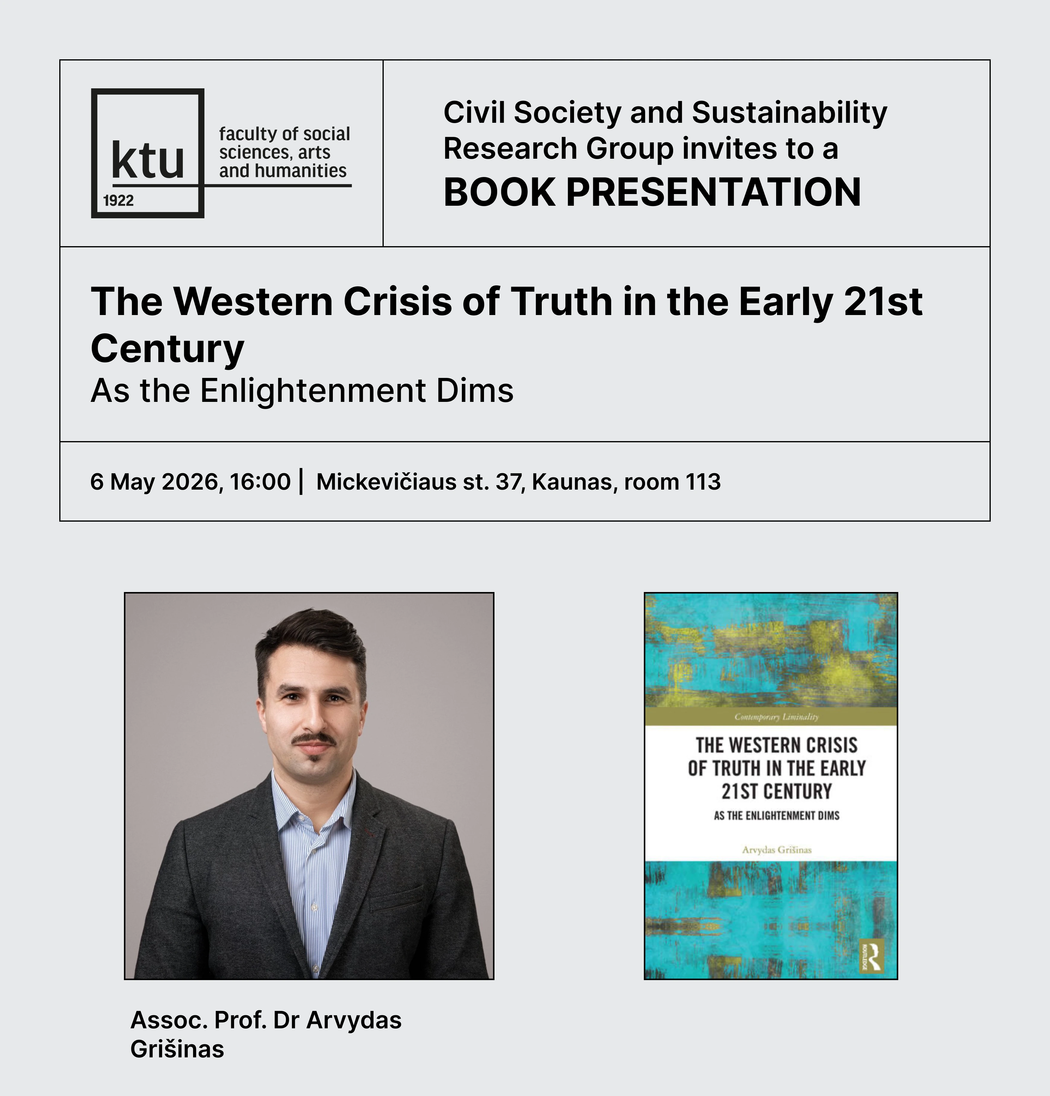 Research Group Civil Society and Sustainability at the Faculty of Social Sciences, Arts and Humanities, invites you to a book presentation by Dr Arvydas Grišinas “The Western Crisis of Truth in the Early 21st Century. As the Enlightenment Dims”, held at the Faculty of Social Sciences, Arts and Humanities (A. Mickevičiaus st. 37, Kaunas), Room 113.