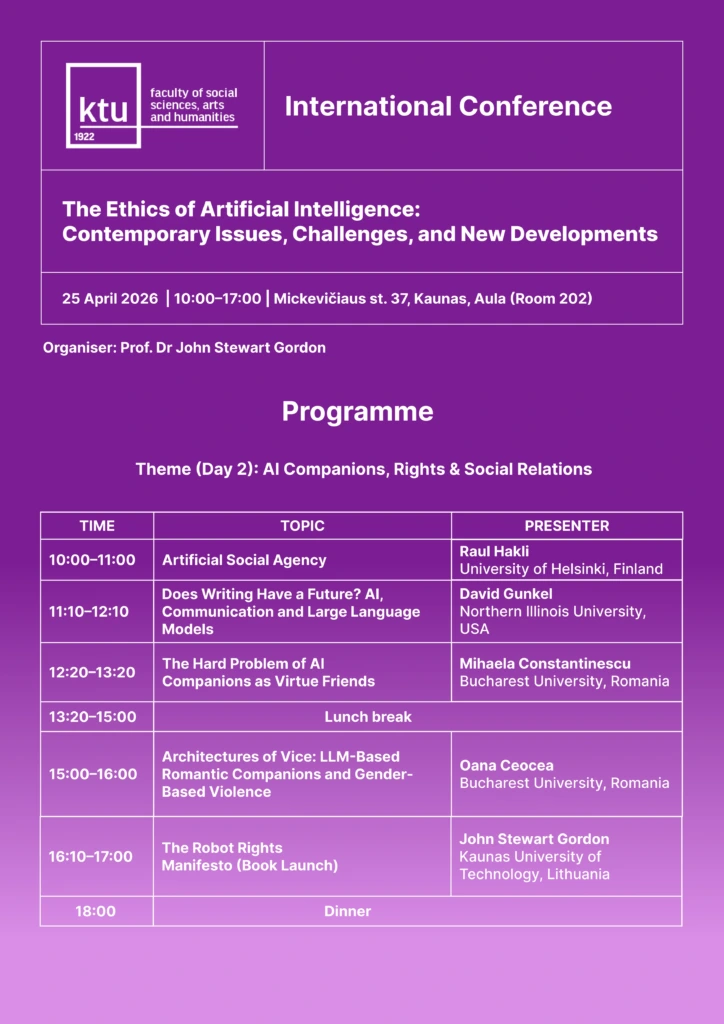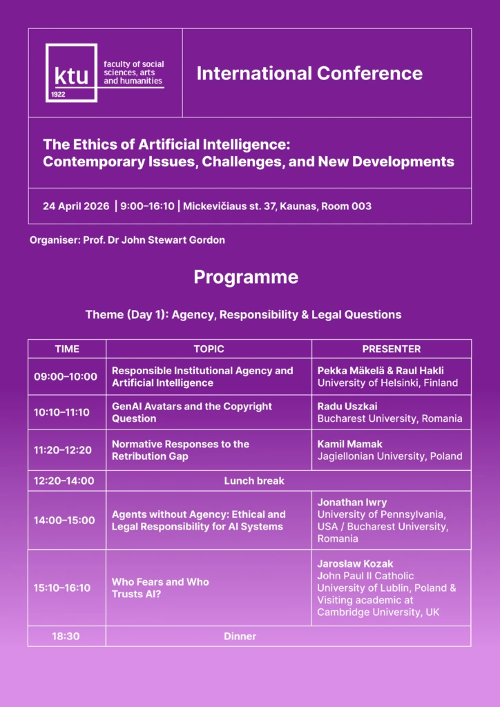 This event marks the inaugural international conference of a broader initiative aimed at providing a forum for the discussion of diverse topics in the ethics of artificial intelligence. The participating universities – five in total – are represented by scholars from Lithuania, Poland, Finland, Estonia, Romania and the USA.
