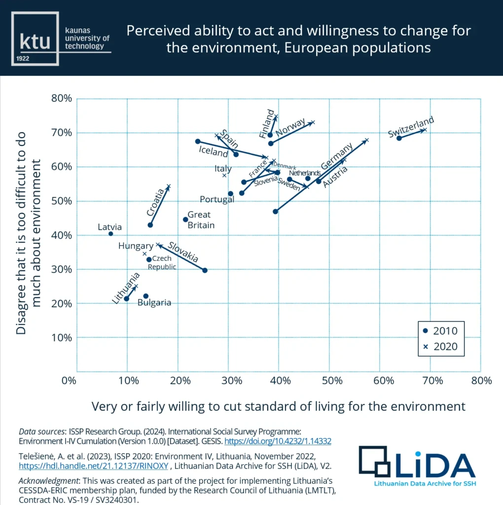 There is, however, some interesting available survey data. Without claiming to provide a comprehensive assessment, we include here a short overview of cumulative International Social Survey Programme (ISSP) Environment data from the 2010 and 2020–2023 surveys for European countries. These data illustrate how willing different populations are to cut their standard of living for the environment, and how they perceive their own ability to act. The chart shows the percentage of respondents who strongly or somewhat disagree that “it is too difficult to do much about the environment” (Y-axis), meaning they have a higher sense of environmental efficacy. The X-axis shows the share of people who report being very or fairly willing to cut their standard of living for the environment. Full datasets can be accessed through the GESIS data archive or other social science data infrastructures within CESSDA-ERIC, including LiDA in Lithuania.